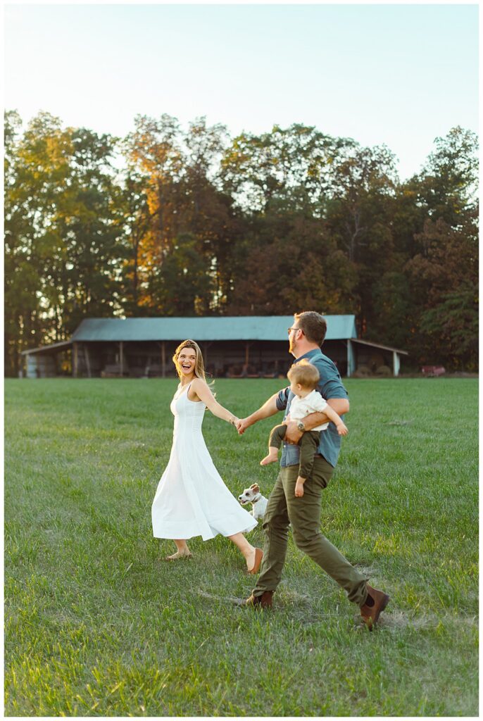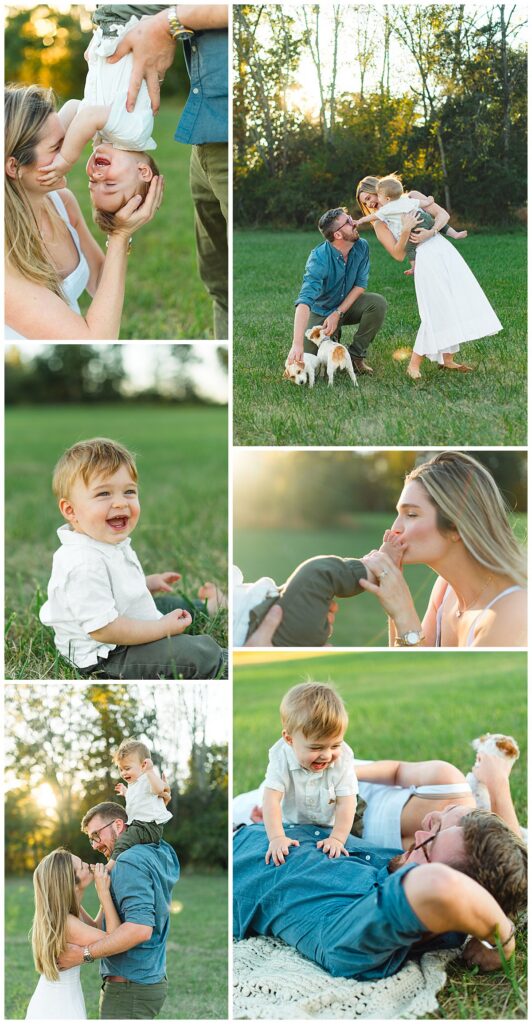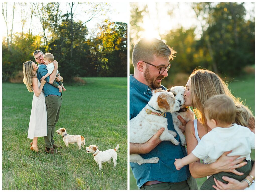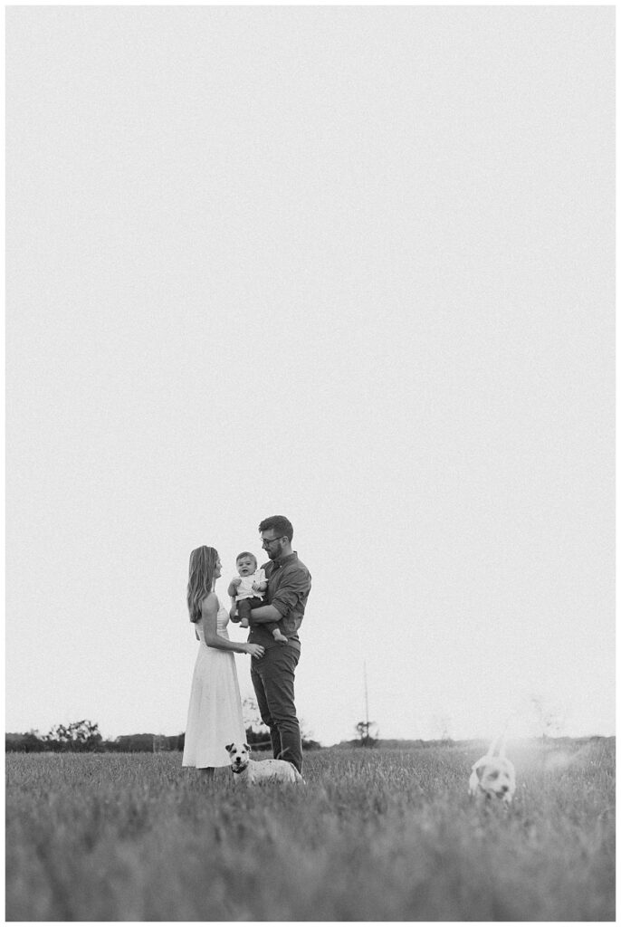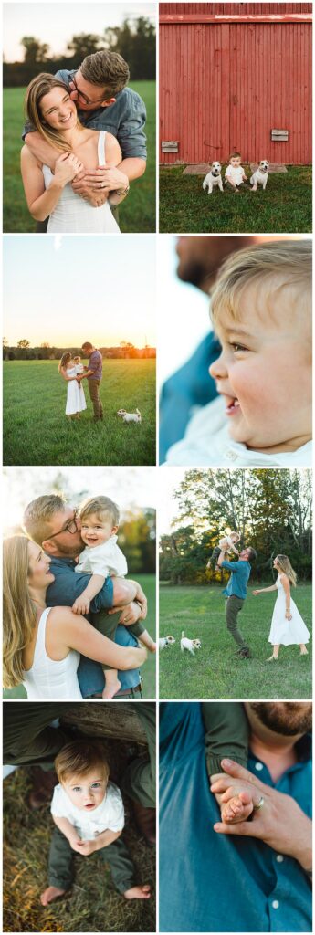 Below is a family who is renovating their farmhouse and wanted to capture their son around his first birthday. We decided to use their surrounding property for their session, as that is where their sons spends nearly every afternoon evening. Outside with the dogs and his mother and father.