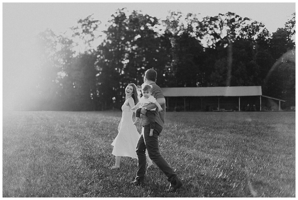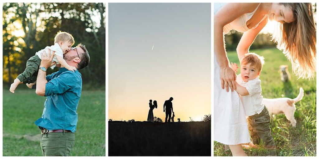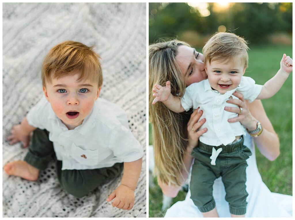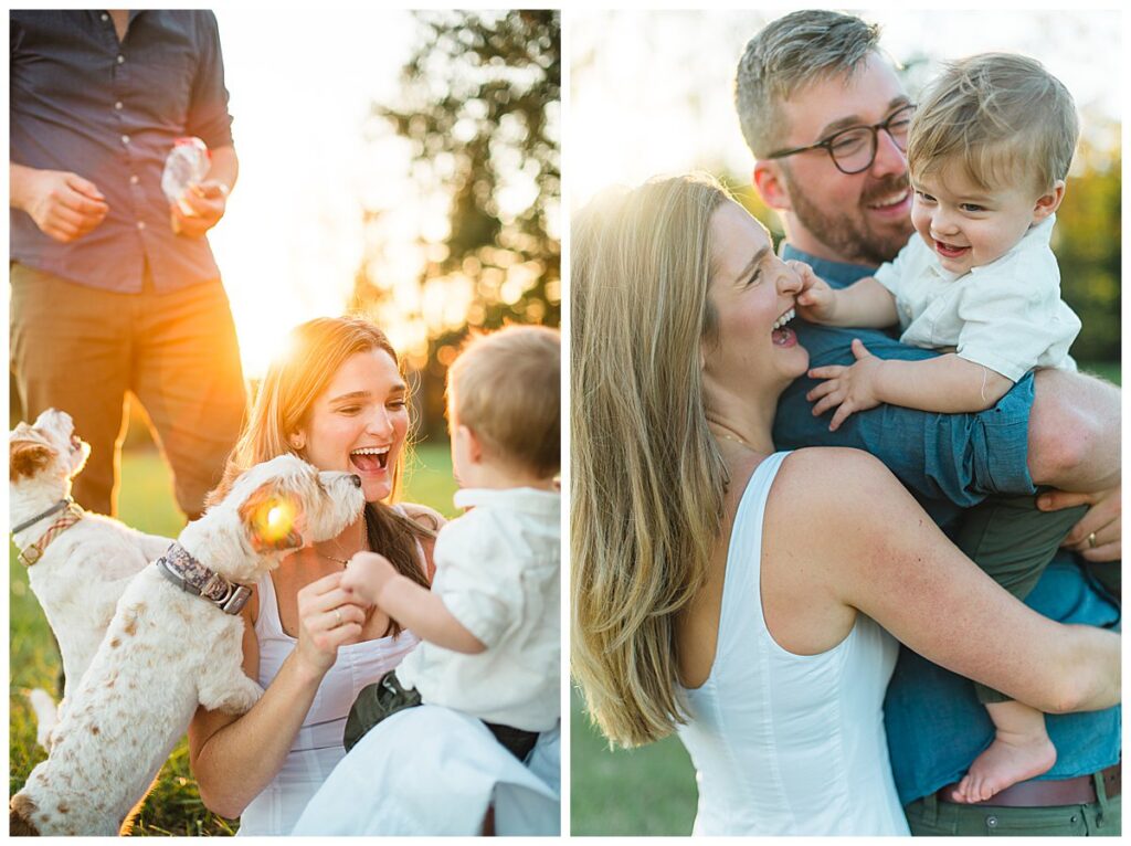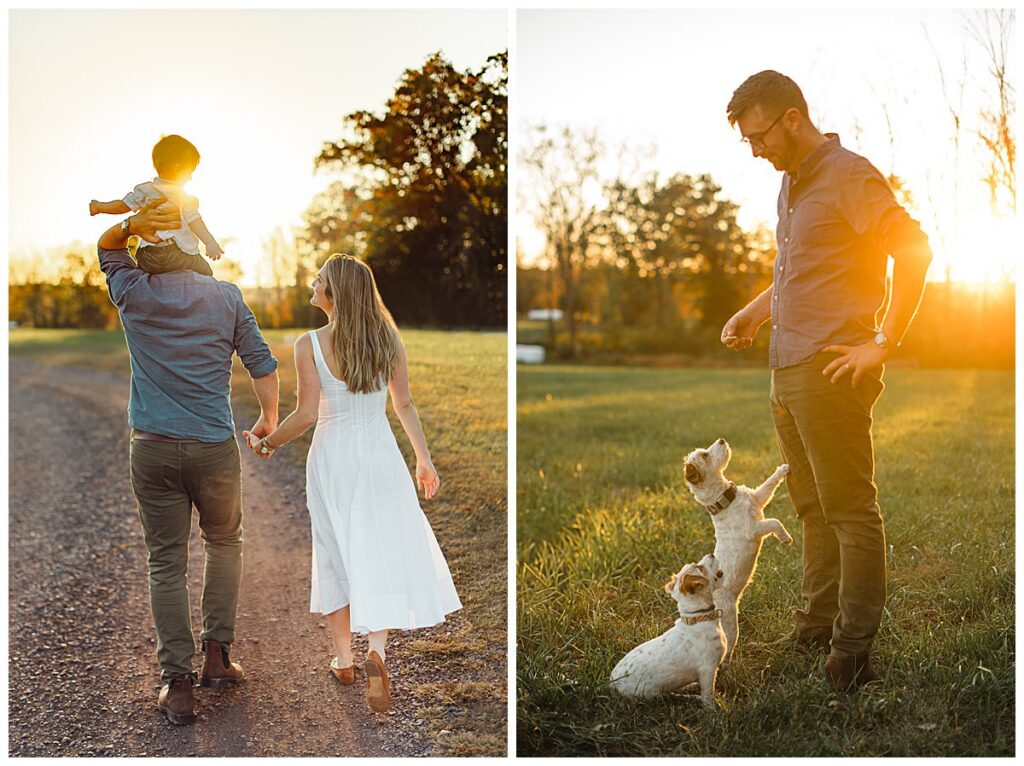 Below is a family who is renovating their farmhouse and wanted to capture their son around his first birthday. We decided to use their surrounding property for their session, as that is where their sons spends nearly every afternoon evening. Outside with the dogs and his mother and father.
